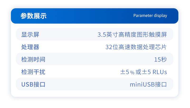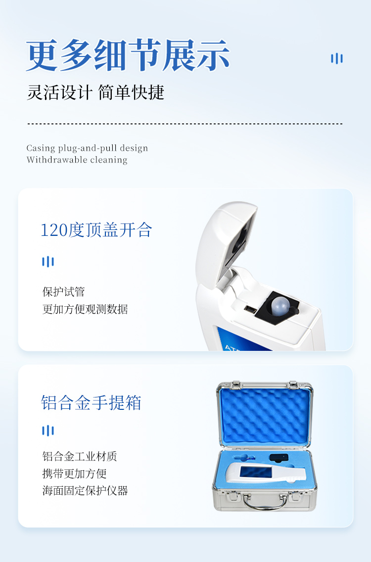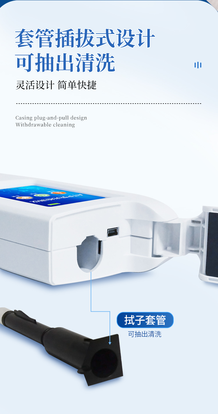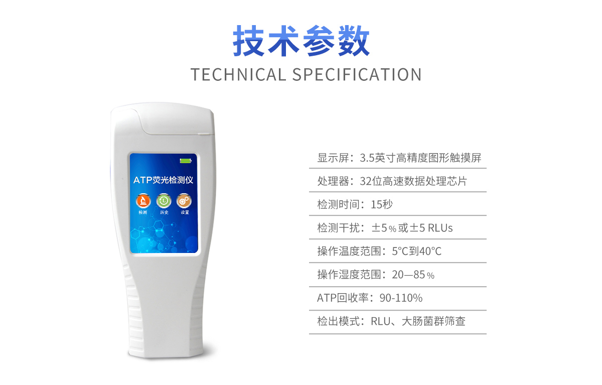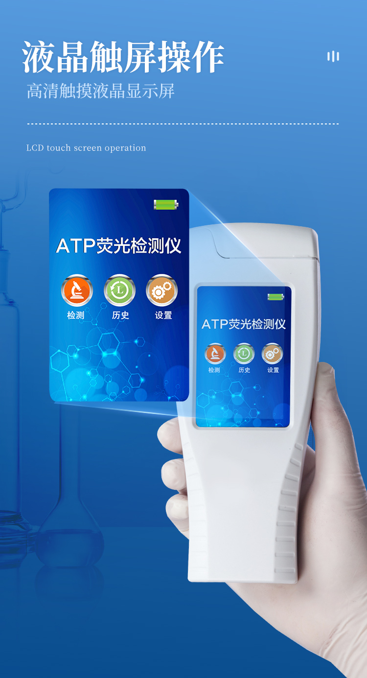 該設(shè)備采用生物化學(xué)反應(yīng)方法檢測ATP含量,潔凈度檢測儀基于螢火蟲發(fā)光原理,利用“熒光素酶—熒光素體系”快速檢測三磷酸腺苷(ATP)。ATP拭子含有可以裂解細胞膜的試劑,能將細胞內(nèi)ATP釋放出來,與試劑中含有的特異性酶發(fā)生反應(yīng),產(chǎn)生光,再用熒光照度計檢測發(fā)光值,微生物的數(shù)量與發(fā)光值成正比,由于所有生物活細胞中含有恒量的ATP,所以ATP含量可以清晰地表明樣品中微生物與其他生物殘余的多少,用于判斷衛(wèi)生狀況。