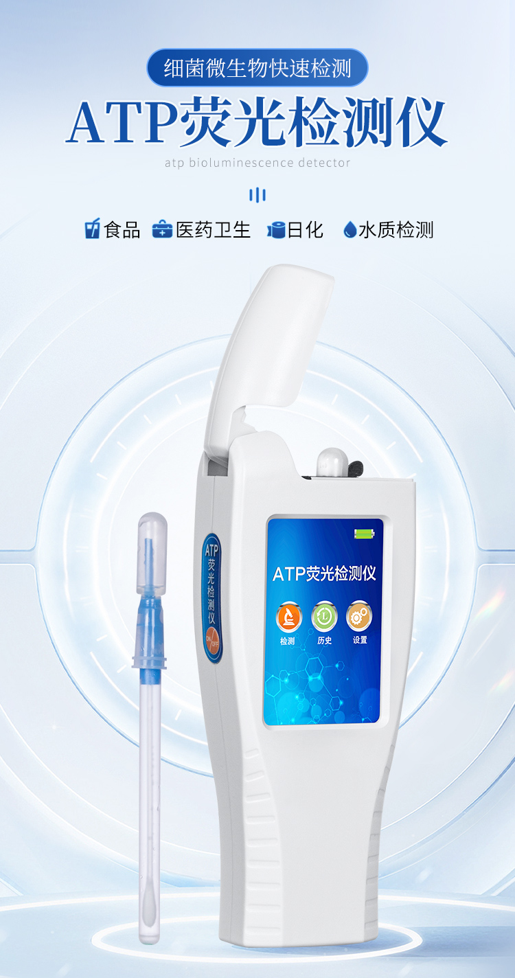 該設(shè)備為全新升級產(chǎn)品,大屏幕觸摸顯示屏,代替?zhèn)鹘y(tǒng)按鍵。操作采用生物化學(xué)反應(yīng)方法檢測ATP含量,ATP熒光檢測儀基于螢火蟲發(fā)光原理,利用“熒光素酶—熒光素體系”快速檢測三磷酸腺苷(ATP)。ATP拭子含有可以裂解細(xì)胞膜的試劑,能將細(xì)胞內(nèi)ATP釋放出來,與試劑中含有的特異性酶發(fā)生反應(yīng),產(chǎn)生光,再用熒光照度計檢測發(fā)光值,微生物的數(shù)量與發(fā)光值成正比,由于所有生物活細(xì)胞中含有恒量的ATP,所以ATP含量可以清晰地表明樣品中微生物與其他生物殘余的多少,用于判斷衛(wèi)生狀況。