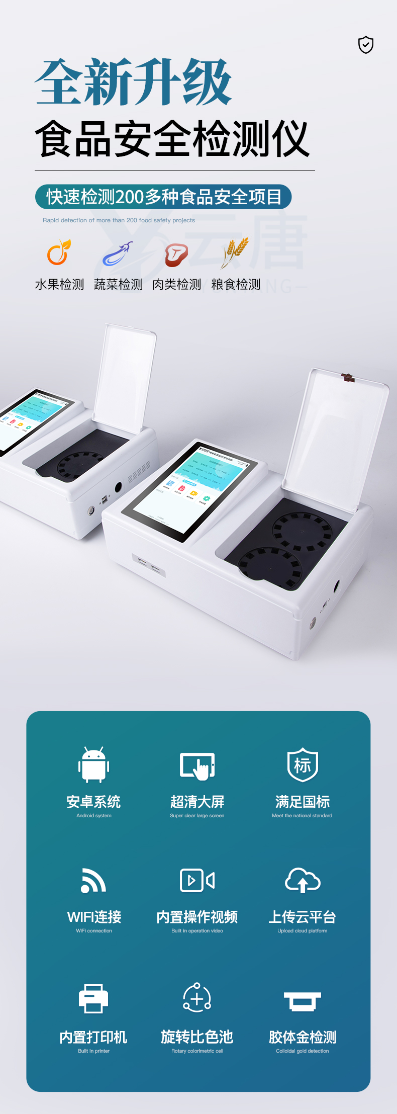 1、儀器采用臺(tái)式一體化系統(tǒng)檢測技術(shù),將分光光度模塊、數(shù)字化管理模塊、無線通訊模塊高度集成于一體,支持檢測200種食品安全檢測項(xiàng)目,同時(shí)預(yù)留升級(jí)檢測方法。