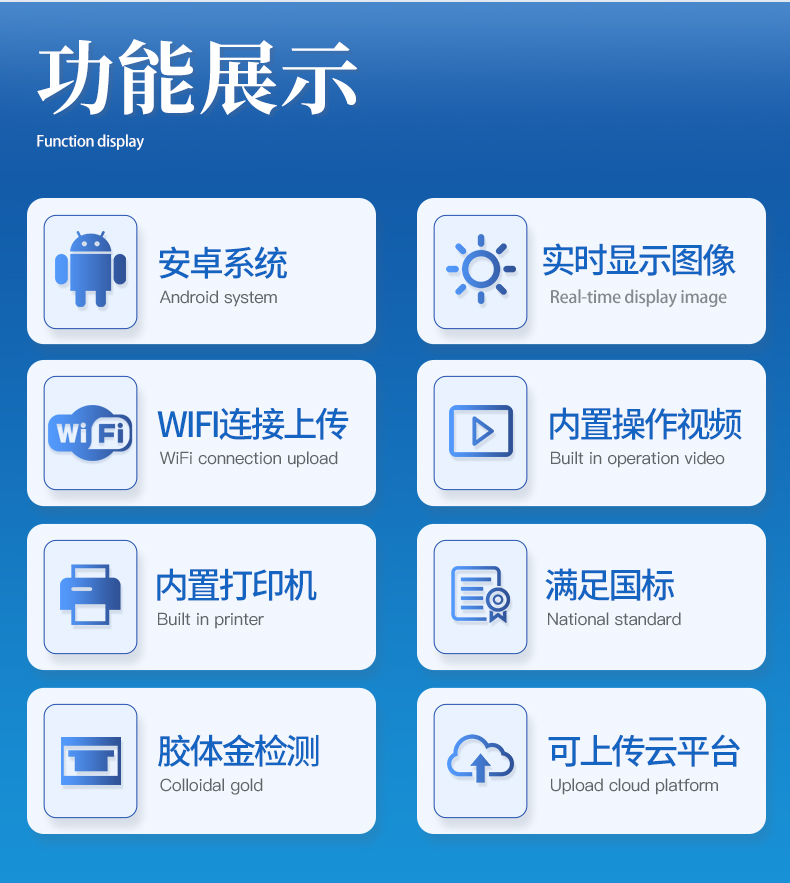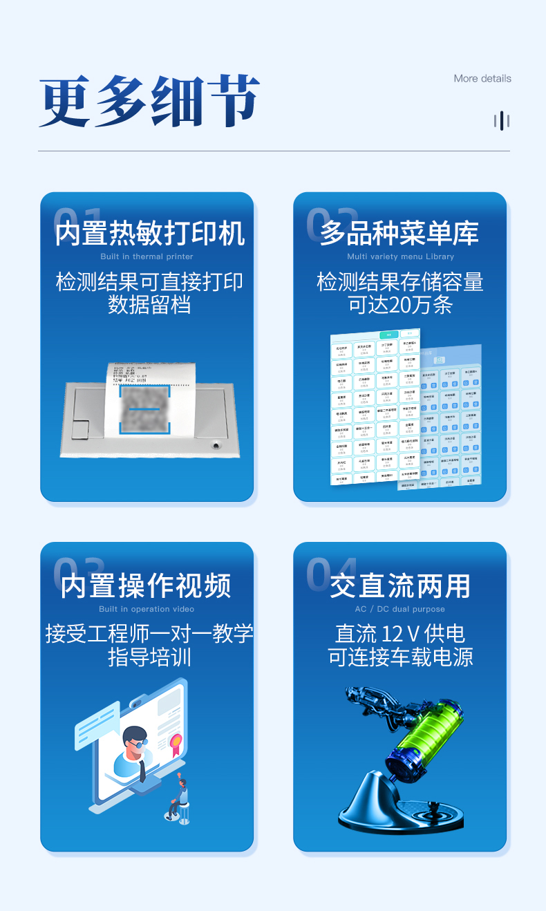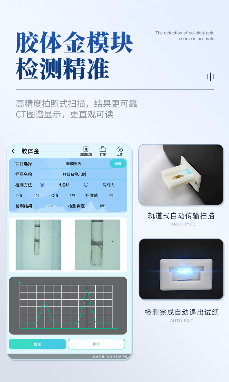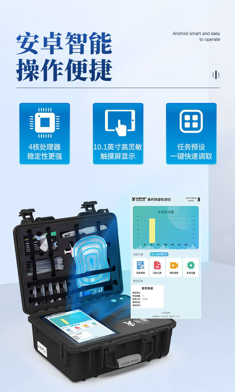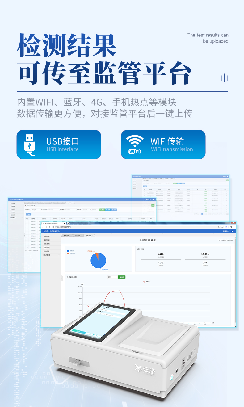 | 儀器采用10.1英寸液晶觸摸屏顯,搭配運行安卓智能操作系統(tǒng),主控芯片采用ARM Cortex-A7,RK3288/4核處理器,主頻1.88Ghz,運轉(zhuǎn)速度更快速,性能更強。 | 儀器功能包括:膠體金檢測模塊、數(shù)字化管理模塊、無線通訊模塊等,可以滿足同一軟件下實現(xiàn)所有檢測項目的檢測,并在同一窗口展示檢測結(jié)果。 | 一體化便攜式快檢設(shè)備,采用交直流兩用供電方式,可連接車載電源,配備6ah大容量充電鋰電池,可以滿足現(xiàn)場及流動檢測使用的需求。儀器尺寸:43×35×20cm, 主機凈重:5.1kg | 系統(tǒng)自帶數(shù)據(jù)集成模塊,設(shè)備首頁自動統(tǒng)計檢測數(shù)據(jù)包含:周檢測數(shù)據(jù)、月檢測數(shù)據(jù),全部檢測總數(shù)量,均包含檢測總數(shù),合格數(shù),不合格數(shù),以及相關(guān)柱形分析圖,對各項檢測數(shù)據(jù)清晰掌握,無需電腦查詢,更加快捷直觀。 | 儀器具有任務(wù)預設(shè)模塊,可在樣品送檢前提前預設(shè)樣品名稱、檢測指標、送檢單位等信息,樣品送檢時一鍵調(diào)取保存信息,檢測更加方便快捷。 | 膠體金檢測模塊: 直插式自動掃描方式,可實時顯示金標卡實時圖像,系統(tǒng)自動分析并呈現(xiàn)出CT曲線圖,CT線自動識別,無需手動調(diào)整,完成檢測后自動退出檢測卡。 結(jié)果判定線可修改,對照值標定值可保存,斷電不丟失數(shù)據(jù)。 兼容市場上其他膠體金卡,使用耗材不受限制,極大增強用戶使用體驗。 | 儀器檢測系統(tǒng)擁有龐大數(shù)據(jù)庫,并且構(gòu)建了完善的檢索、修訂功能。食品庫涵蓋多種樣品名稱,可按需添加或刪除、編輯樣品名稱;產(chǎn)品數(shù)據(jù)庫以及歷史檢測記錄支持一鍵檢索功能。 | 系統(tǒng)打印自定義化,打印格式多樣化,產(chǎn)品合格證(國家標準要求),二維碼,抽樣信息、檢測信息,受檢信息、復核信息、抽樣日期、檢測日期等信息結(jié)果,可按需求自行設(shè)置打印內(nèi)容。 | A4紙版本報告打印功能(可選配):設(shè)備擁有兩種結(jié)果展示方式,可以自動生成A4打印模板和小票打印模板兩種樣式,可通過WiFi及網(wǎng)線等方式鏈接外置打印機可進行打印 | 儀器具有 wifi 聯(lián)網(wǎng)上傳、RJ45網(wǎng)線連接功能,可以快速上傳數(shù)據(jù)。同步對接監(jiān)管平臺,數(shù)據(jù)可局域網(wǎng)和互聯(lián)網(wǎng)數(shù)據(jù)上傳,檢測結(jié)果直接傳至食品安全監(jiān)管平臺。進行區(qū)域食品安全監(jiān)管及大數(shù)據(jù)分析處理與數(shù)據(jù)統(tǒng)計,檢測區(qū)域食品安全長短期動態(tài),達到食品安全問題預估、預警。 | 設(shè)備支持U盤存儲,標準USB接口,免驅(qū)動安裝。檢測結(jié)果存儲容量20萬條以上,可生成Excel表格,進行一鍵拷貝,并具有登錄保護功能,可設(shè)置用戶名及密碼,規(guī)范不同人員操作權(quán)限,防止非工作人員操作,并且可以進行重新校準、鎖定、恢復出廠設(shè)置功能。儀器固件可升級,后期檢測項目可擴充。 | 儀器具備遠程升級功能,可定向分客戶分儀器更新,開機后自動更新,并可持續(xù)性免費更新系統(tǒng)版本,無需像傳統(tǒng)產(chǎn)品返廠更新,節(jié)省時間及人力成本并避免了物流運輸返廠升級導致設(shè)備損壞的潛在風險。 |