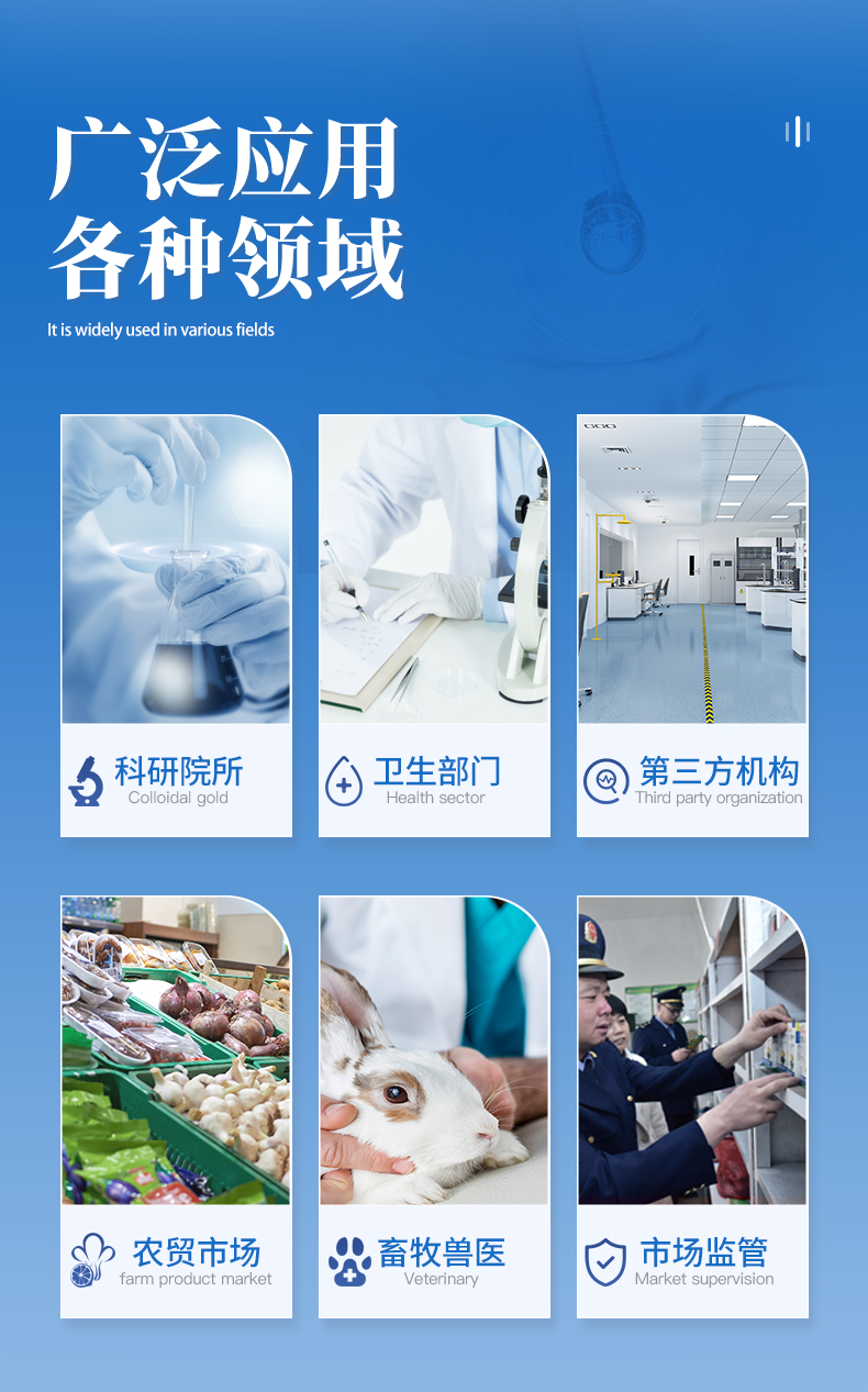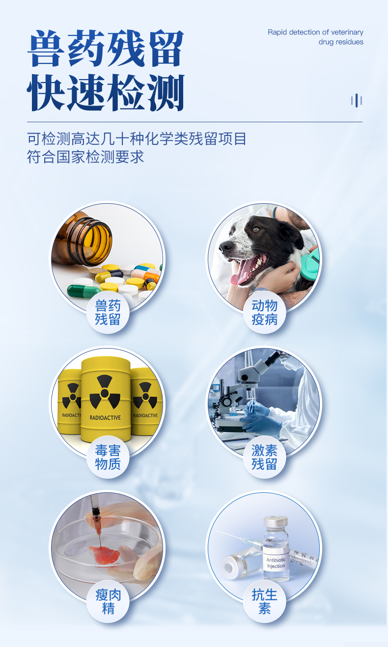 | 瘦肉精激素:鹽酸克倫特羅、沙丁胺醇、萊克多巴胺、己烯雌酚等 | 抗生素殘留:四環(huán)素類、硝基呋喃類、磺胺類、β-興奮劑類、沙星類、磺胺類、喹諾酮類,甲砜霉素,氟苯尼考,金剛烷胺、替米考星、慶大霉素、林可霉素、鏈霉素、恩諾沙星、環(huán)丙沙星、頭孢啦啶、青霉素、阿莫西林等 | 水產(chǎn)品安全類:孔雀石綠、氯霉素、呋喃妥因、呋喃西林、呋喃它酮、呋喃唑酮等 | 蛋類藥物殘留:氯霉素,四環(huán)素,磺胺類,喹諾酮類,呋喃西林,呋喃它酮,呋喃妥因,呋喃唑酮,氟苯尼考,阿莫西林、頭孢氨芐、紅霉素、鏈霉素等 | 動物疫病類:禽流感、新城疫、牛羊口蹄疫、牛羊結(jié)核病、牛羊包蟲、牛羊布病、小反芻獸、豬藍耳病毒、豬瘟病毒、豬偽狂犬病毒、豬細小、豬圓環(huán)、犬細小病毒、犬瘟熱病毒、犬狂犬病毒等 | 真菌毒素殘留:食用油、糧食及飼料中黃曲霉毒素B1、黃曲霉毒素總量,奶中黃曲霉毒素M1、嘔吐毒素、玉米赤霉烯酮、赭曲霉毒素A、T2毒素、伏馬毒素等 |