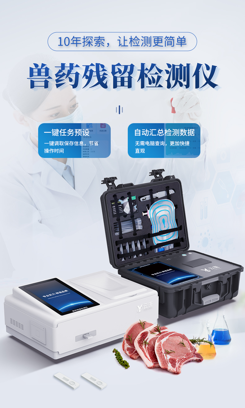 山東云唐智能科技有限公司生產(chǎn)的高智能獸藥殘留檢測儀可快速檢測瘦肉精激素類食品安全項目,包含鹽酸克倫特羅、沙丁胺醇、萊克多巴胺、己烯雌酚,獸藥殘留、抗生素類殘留、真菌毒素類殘留、動物疫病類等檢測